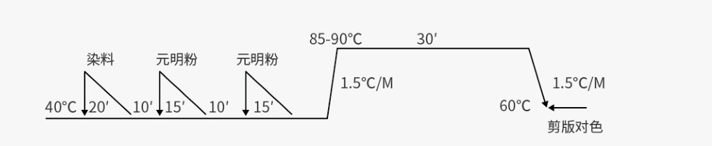 注:視設(shè)備不同,工藝需參照調(diào)整,本工藝適用于溢流、汽液、汽流設(shè)備染色。